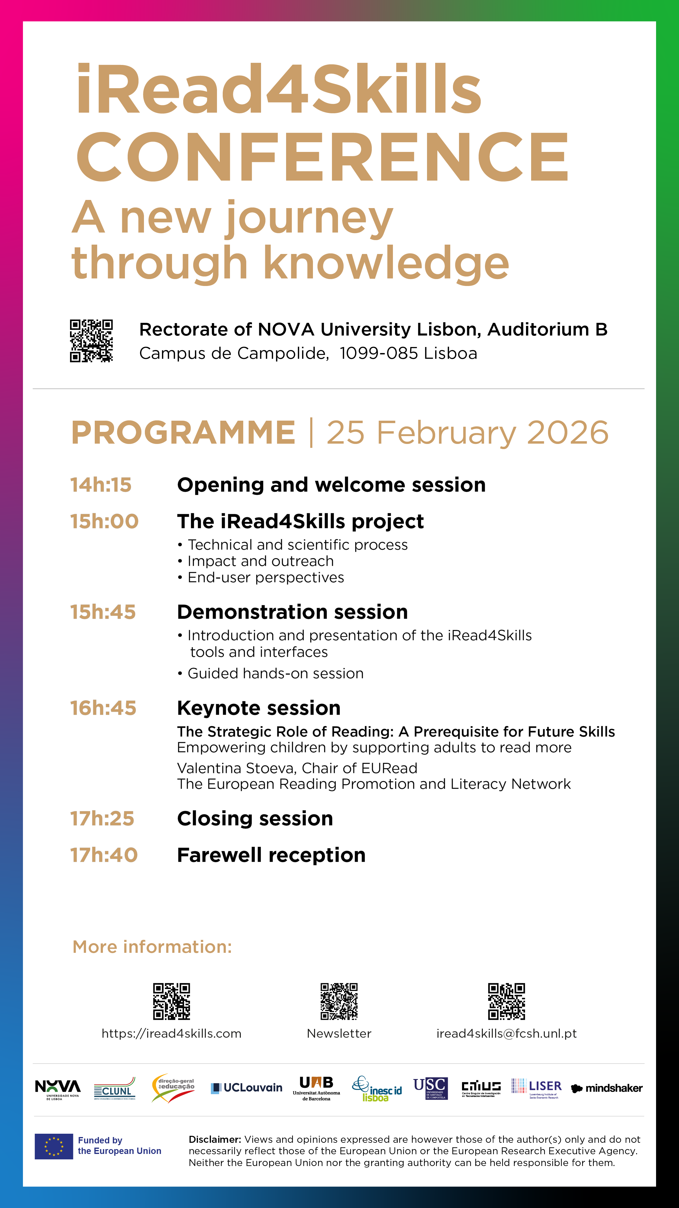 The iRead4Skills Final Conference will take place on 25 February 2026 from 14:15 CET at the Rectorate of NOVA University Lisbon (Auditorium B). The event will be held in a hybrid format, with the possibility to attend either onsite in Lisbon or online.Under the title “A new journey through knowledge”, the conference will present the main results of the iRead4Skills project and explore the strategic role of reading as a foundation for future skills development. The event will bring together researchers, practitioners and policy stakeholders to reflect on innovation in literacy and skills policy.Participation is free of charge, but registration is mandatory.